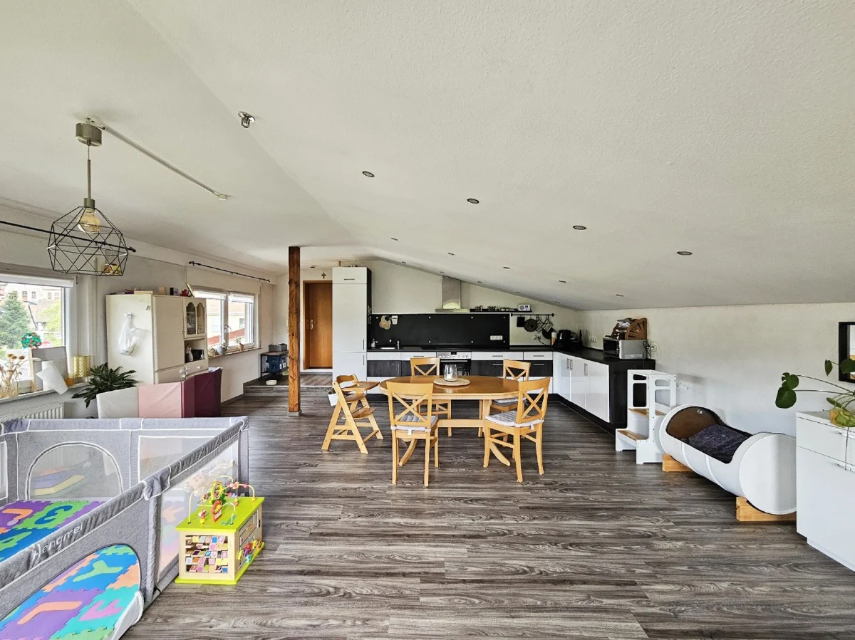 Eine geschmackvolle Holztreppe führt aus der Diele direkt in den Wohnraum der 2. Etage. Der ca. 46qm große, lichtdurchflutete Küchen- und Wohnbereich, welcher harmonisch und durchdacht im Dachgeschoss eingepasst wurde, besticht unter anderem mit seiner wunderschönen Aussicht.